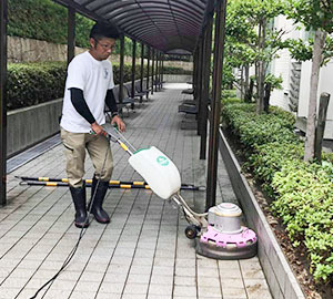前洗浄ののち、床材に合わせた液剤を選択、適正に調整した液剤を塗布します。