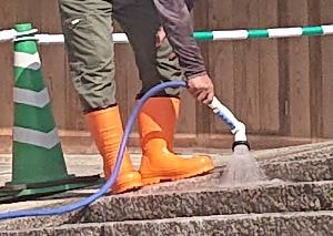 床面施工にあたり、壁や手すり支柱、ドアなどの金属部品をビニールなどで養生し、汚れを落とす前洗浄を行います。